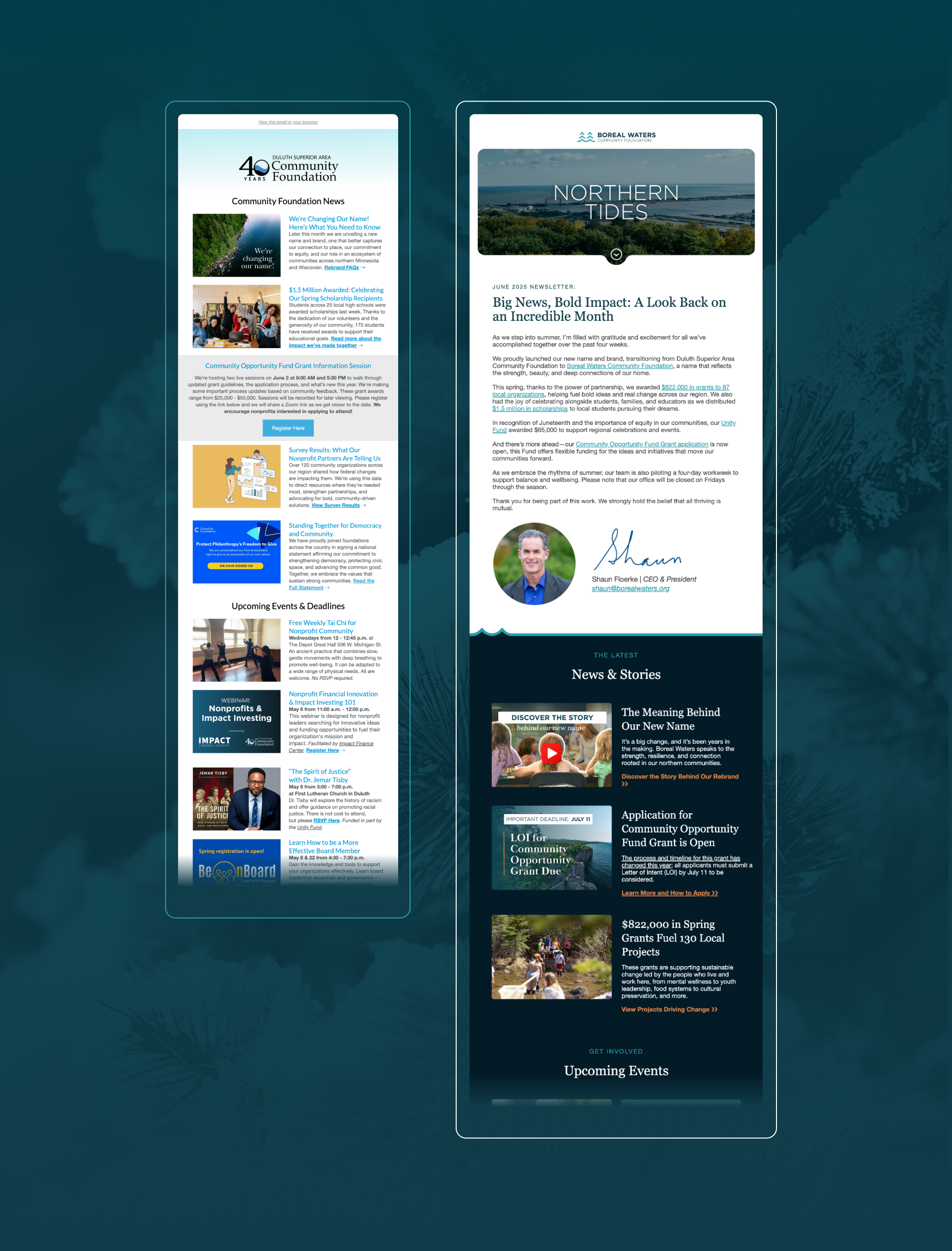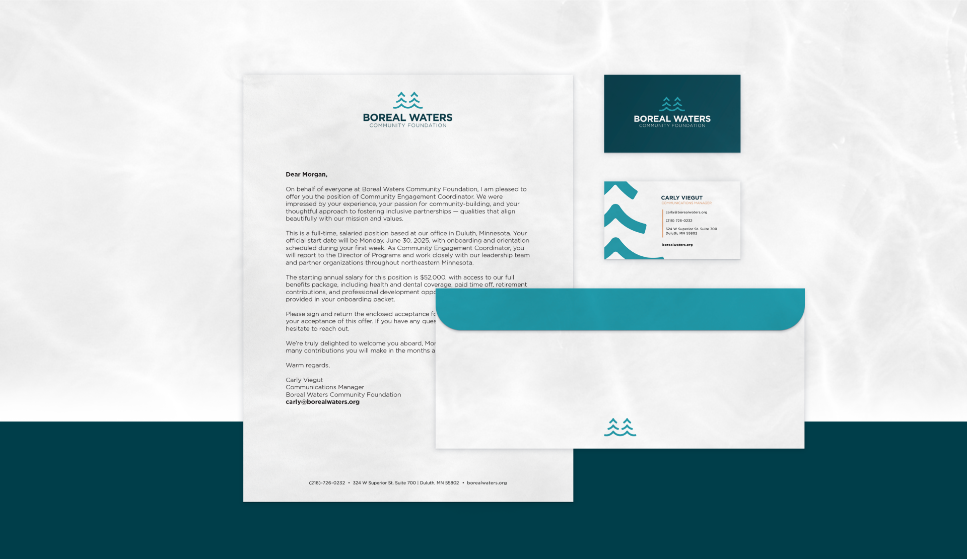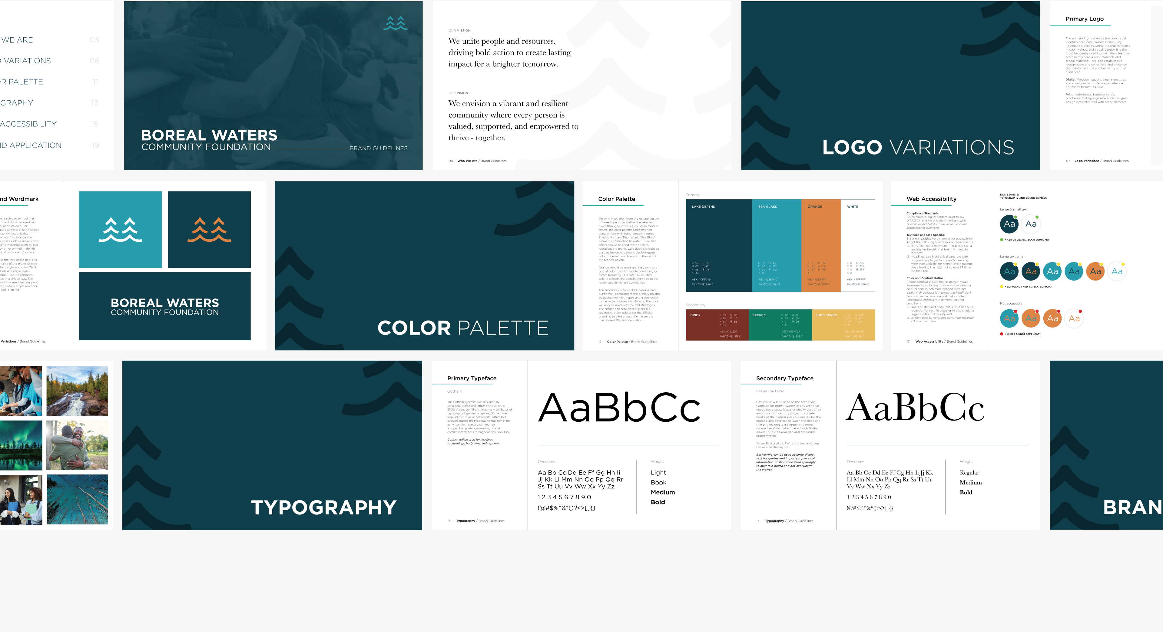 The Duluth Superior Area Community Foundation was looking for a name change and updated brand to better reflect the broader geographic area it has grown to serve. We partner with the organization, and after a lot of research and testing, we landed on Boreal Waters as their new name.