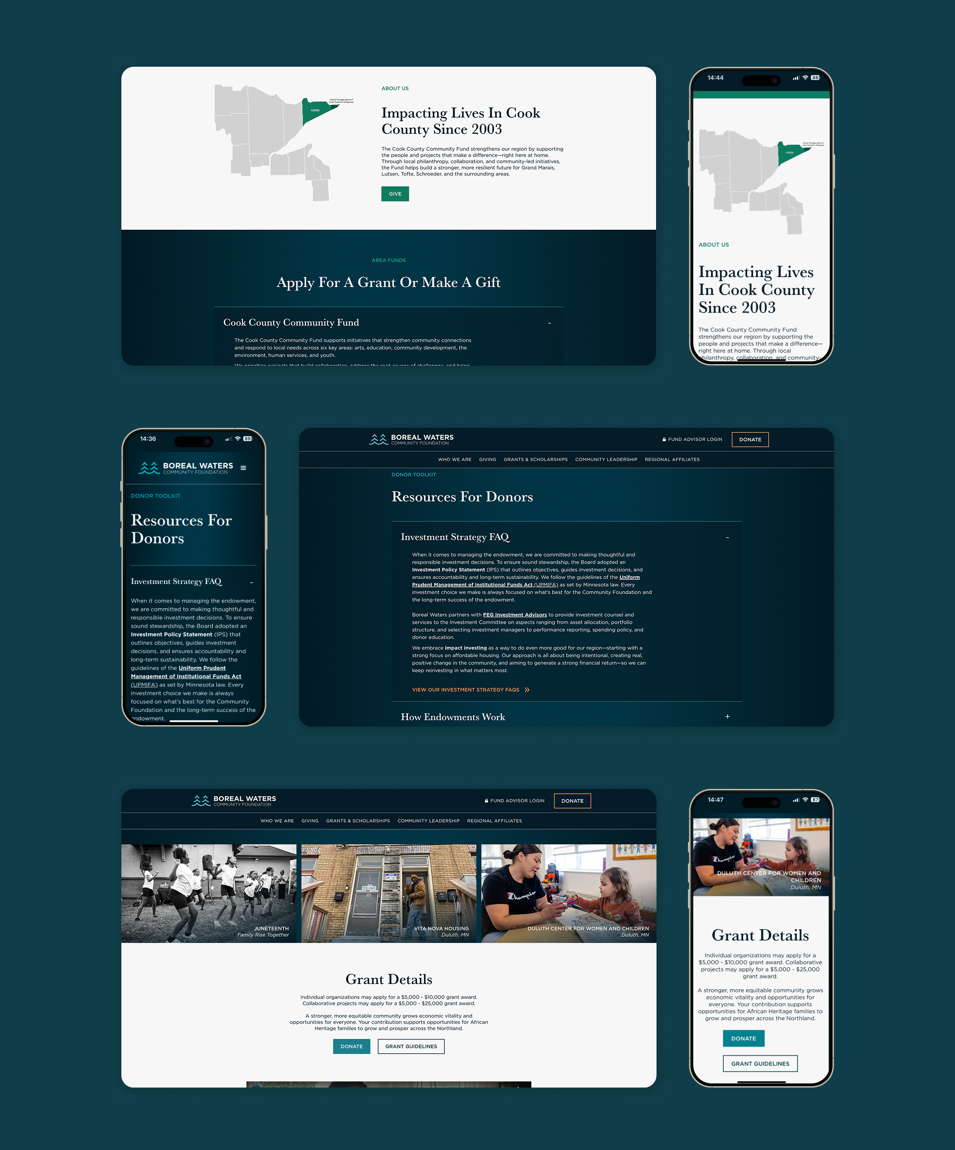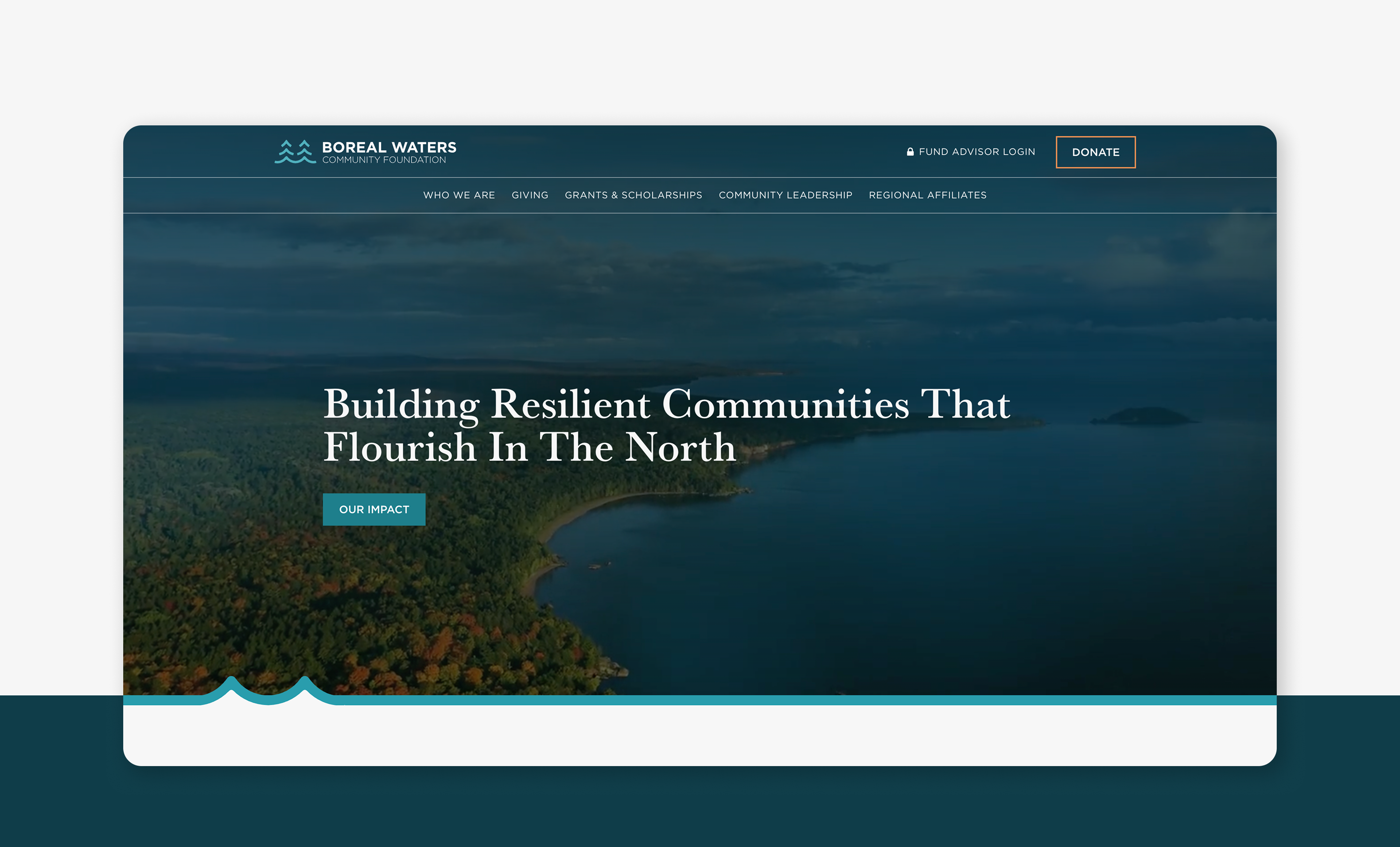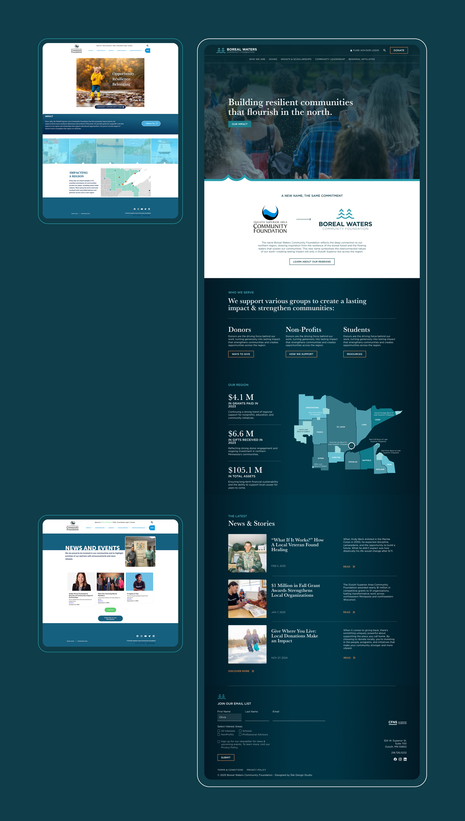 Alongside the new brand, we redesigned Boreal Waters’ website to create a more user-friendly, engaging experience for visitors. The refreshed site shines a spotlight on key areas that advance the Foundation’s mission—making it easier for donors, partners, and community members to understand the impact of their work and get involved. Behind the scenes, we built a streamlined content management system, empowering Boreal Waters’ staff to easily add new stories, events, and updates as the organization continues its important work. The result is a website that not only reflects the strength of the new brand but also helps the Foundation extend its reach and deepen its regional impact.