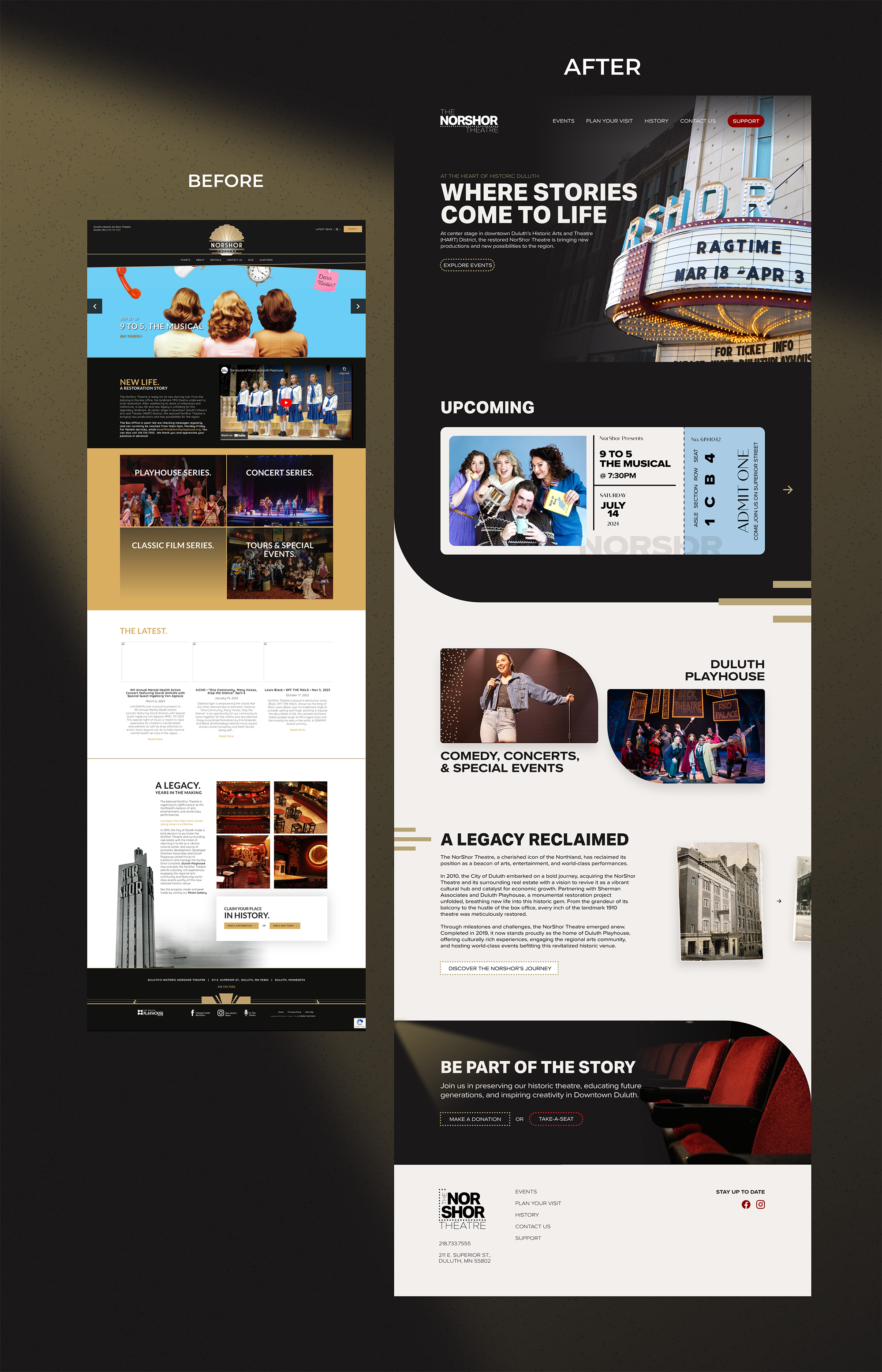 The new website celebrates the NorShor as more than a venue, it’s a living piece of Duluth’s art story. The overall experience showcases bringing new productions and new possibilities to the region. Audiences can now journey through the theater’s history, discover performances, and feel inspired to "meet me at the Norshor".