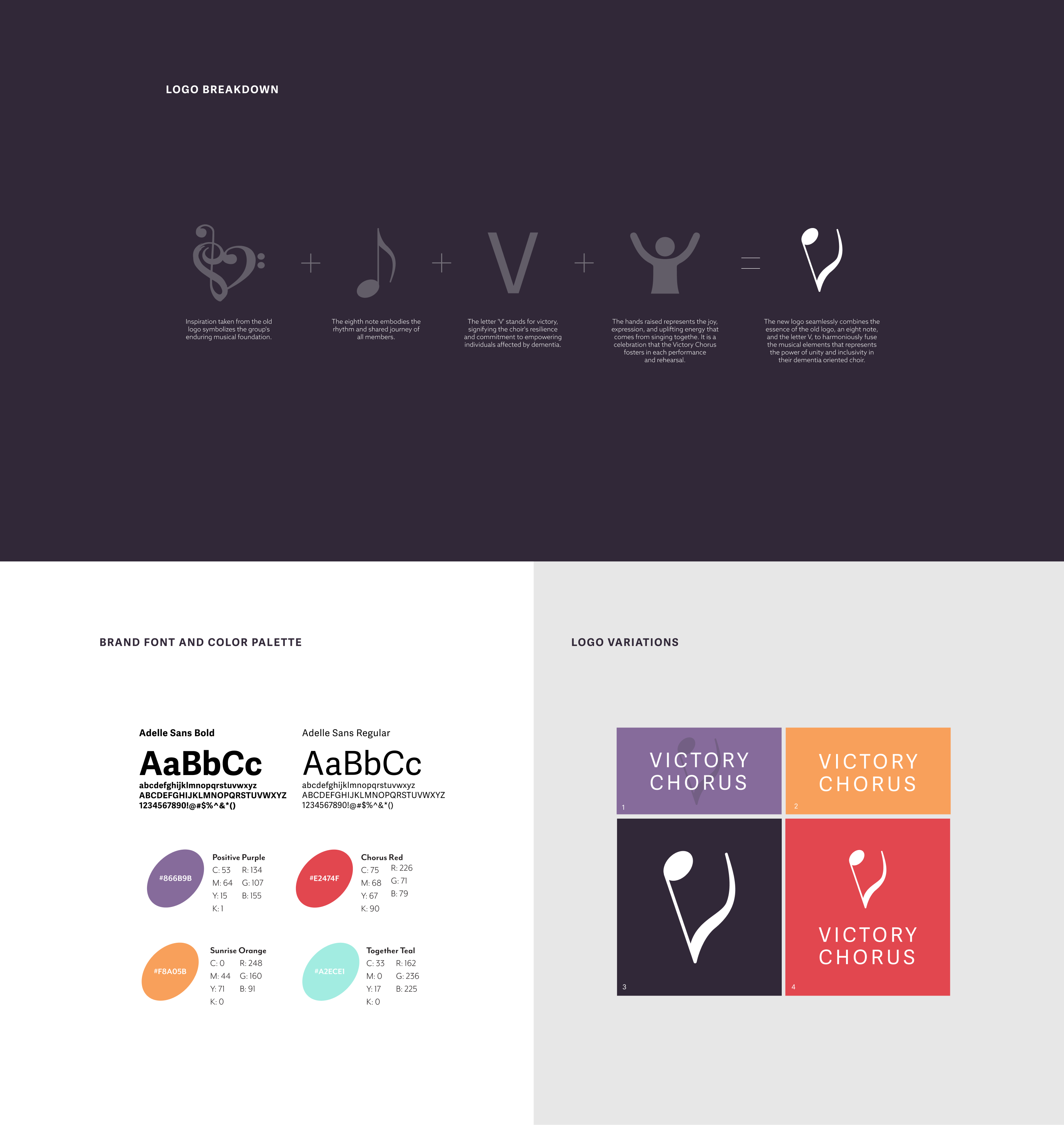 The final logo utilizes an eighth note to embody the rhythm and shared journey among members. The letter V stands for victory. signifying the choir's resilience and commitment to empowering individuals affected by dementia. The logo also symbolizes hands raised overhead in a joyful and uplifting energetic expression that comes from singing together. It is a celebration that the Victory Chorus fosters in each performance and rehearsal. Together the new brand harmoniously fuses elements of music with the power of unity and inclusivity to create the wholistic brand system you see below. The new particularly came to life on the Victory Chorus' website, which was thoughtfully designed with the Victory Chorus' older audience and accessibility in mind.